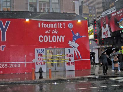 In fact, I’d been inside the Brill Building without realizing it–its ground floor is home to the historic Colony Records. Which is one of those landmarks that you always expect is going to close someday, although at the moment it seems to be alive and well, albeit undergoing refurbishment (nice to see that they’ve replicated their “happy girl” sign on the construction enclosure):