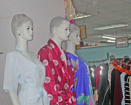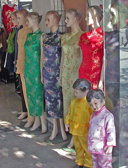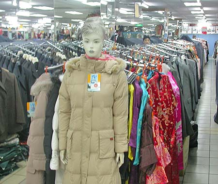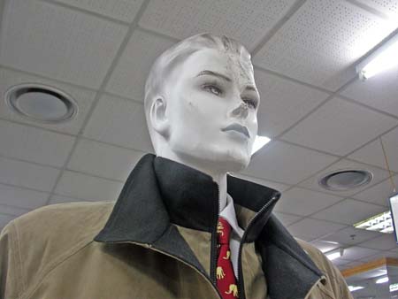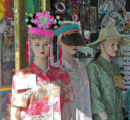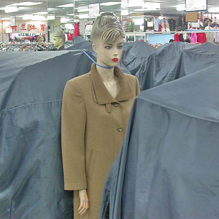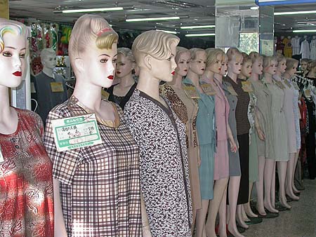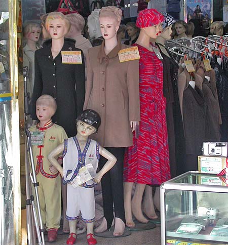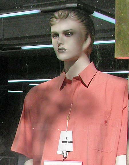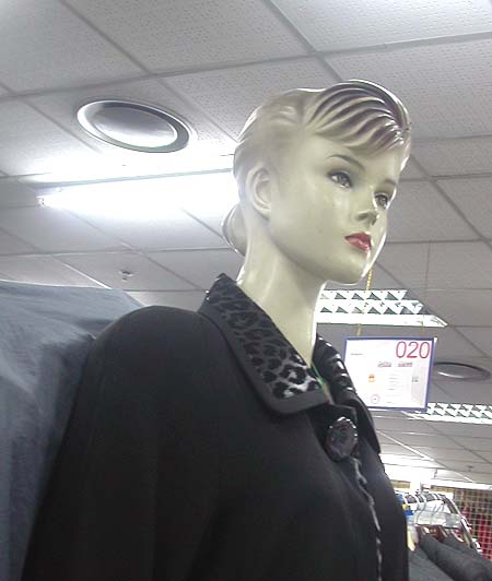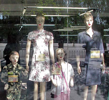 When I visited Beijing in August, 2004, I found that part of it felt like Fifth Avenue, and other parts were still pure Communist Hellhole. And then there were certain things that were neither of the above--such as the dummies that clothing stores used to display their wares. I find them fascinating, and I'm still not sure why. Maybe it's the facial expressions, which tend towards a certain blase dignity even when the dummy is wearing a bizarre hat or, in sweltering weather, a heavy coat. (The female figures all look like Barbie crossed with Lucille Ball in a bad mood.) Maybe it's that they appeared not just in big stores but everywhere, including little hole-in-the-wall joints, and sometimes seemed to be forming veritable armies. It could be that though few of the dummies look very Asian in terms of ethnicity, they're very Asian on some level I don't quite understand. Or maybe it's just that I fascinate easy.